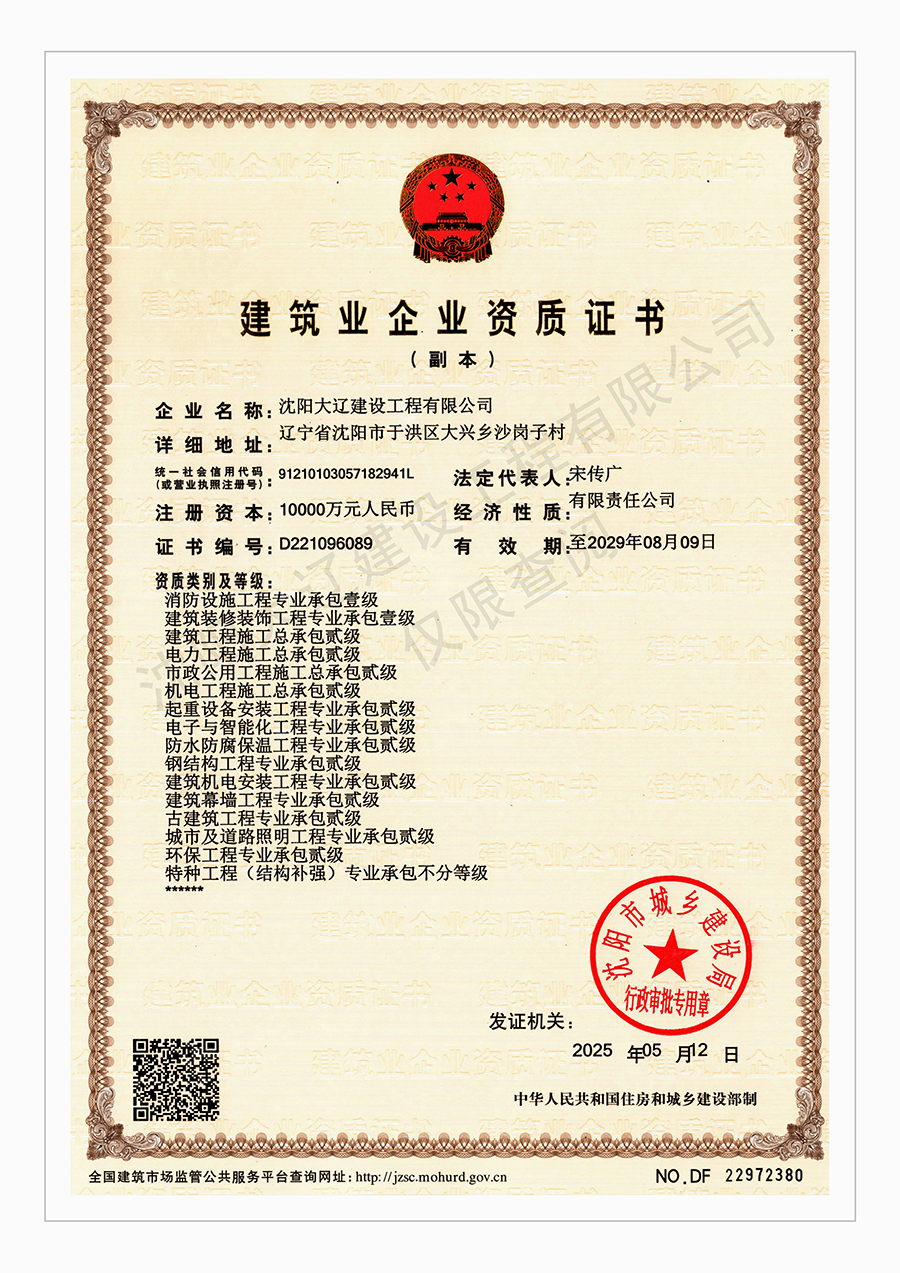 沈阳大辽建设资质-资质证书