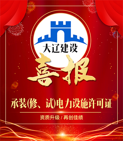 近日,沈阳大辽建设有限公司资质升级工作再传喜讯,经国家能源局东北监管局相关部门核准,公司的承装(修、试)电力设施许可证成功升级。承装(修、试)电力设施许可证的成功升级,是继承包类资质升级、三体系证书、3A信用等级证书、安全生产许可证等之后资质体系的又一次升级。